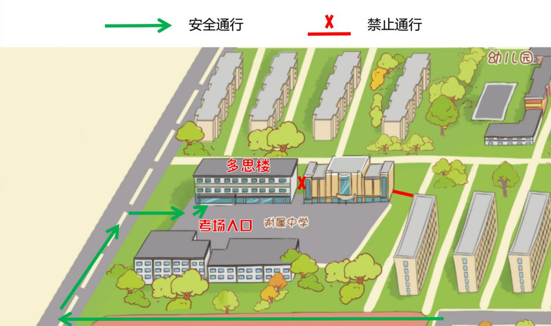 3.非本校应届考生在每场考试结束后,从原路离开考场,经过安全通道离开学校时,严禁翻越警戒线进入校园。