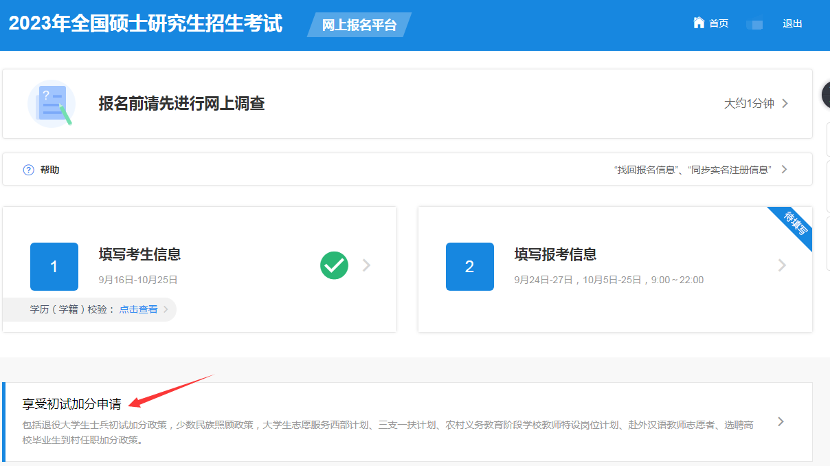 符合初试加分政策规定条件并申请享受初试加分政策的考生,应在完成报名信息填报后在“享受初试加分申请”(网上报名首页中部)模块提交申请,相关部门审核通过后考生可享受相应政策。报名期间可取消或修改相关申请。