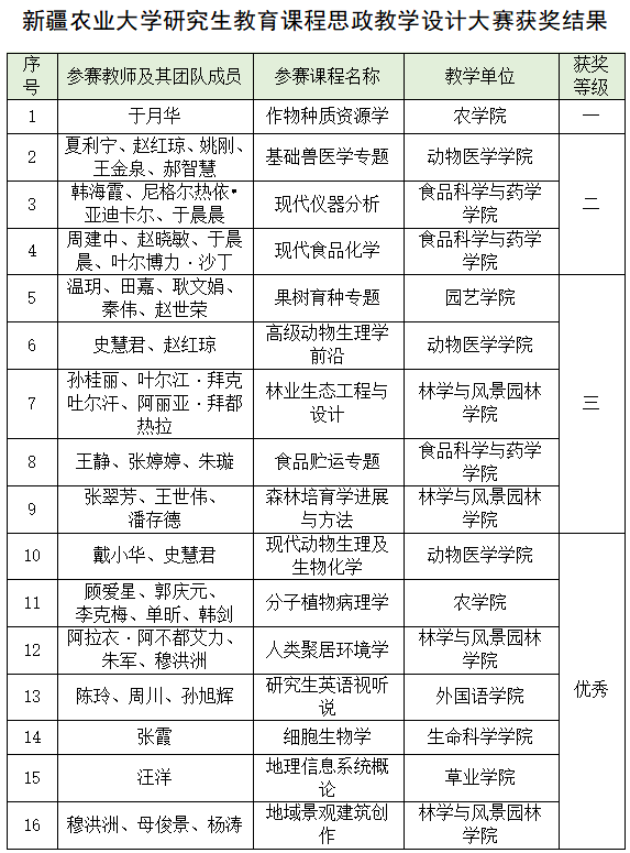 经过激烈的角逐和评审,共评出一等奖1项、二等奖3项、三等奖5项、优秀奖7项。同时,根据教学单位报名参赛课程数及获奖情况评选出优秀组织奖单位4个,分别是:动物医学学院、食品科学与药学学院、林学与风景园林学院、农学院。