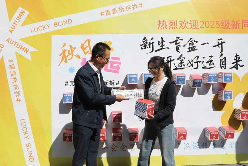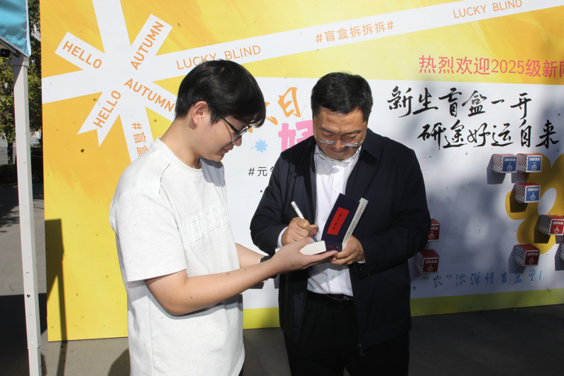 为了增添一份幸运,同学们积极邀请校领导一同参与抽盲盒活动,亲自为抽盲盒的同学签名并寄语,领导的亲切行为使新生对大学生活不再因未知而感到迷茫,新生的校园生活在领导的祝福中拉开帷幕。