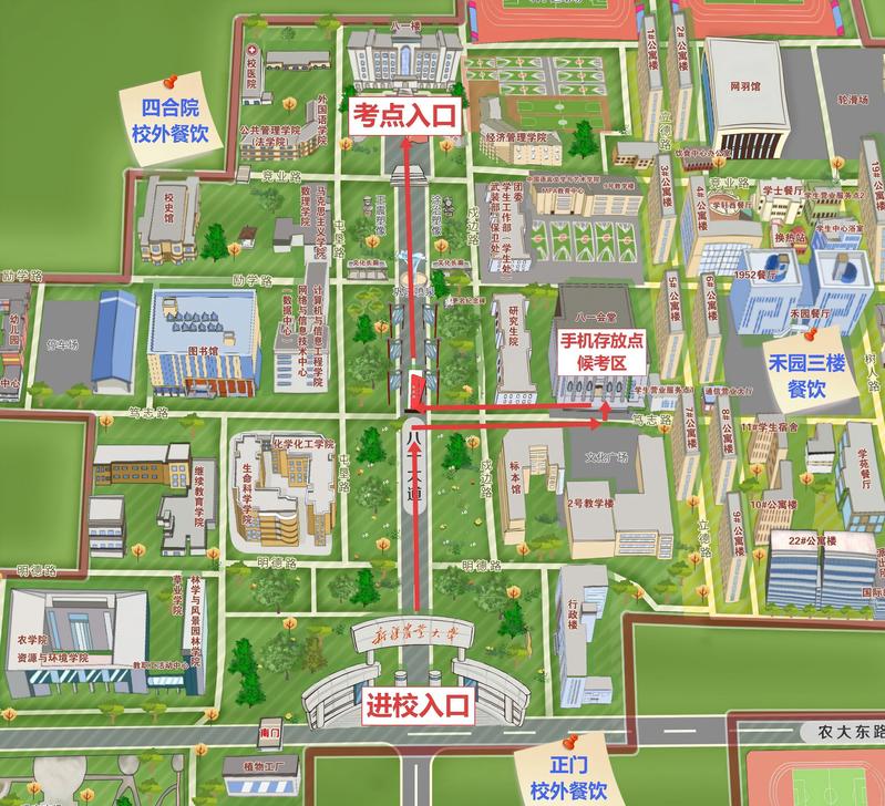考生中午可在学校附近就餐,学校正门外、农大四合院、禾园餐厅三楼都有较多校外餐饮商户选择,请预留充裕的时间,就餐后提前到达考场。