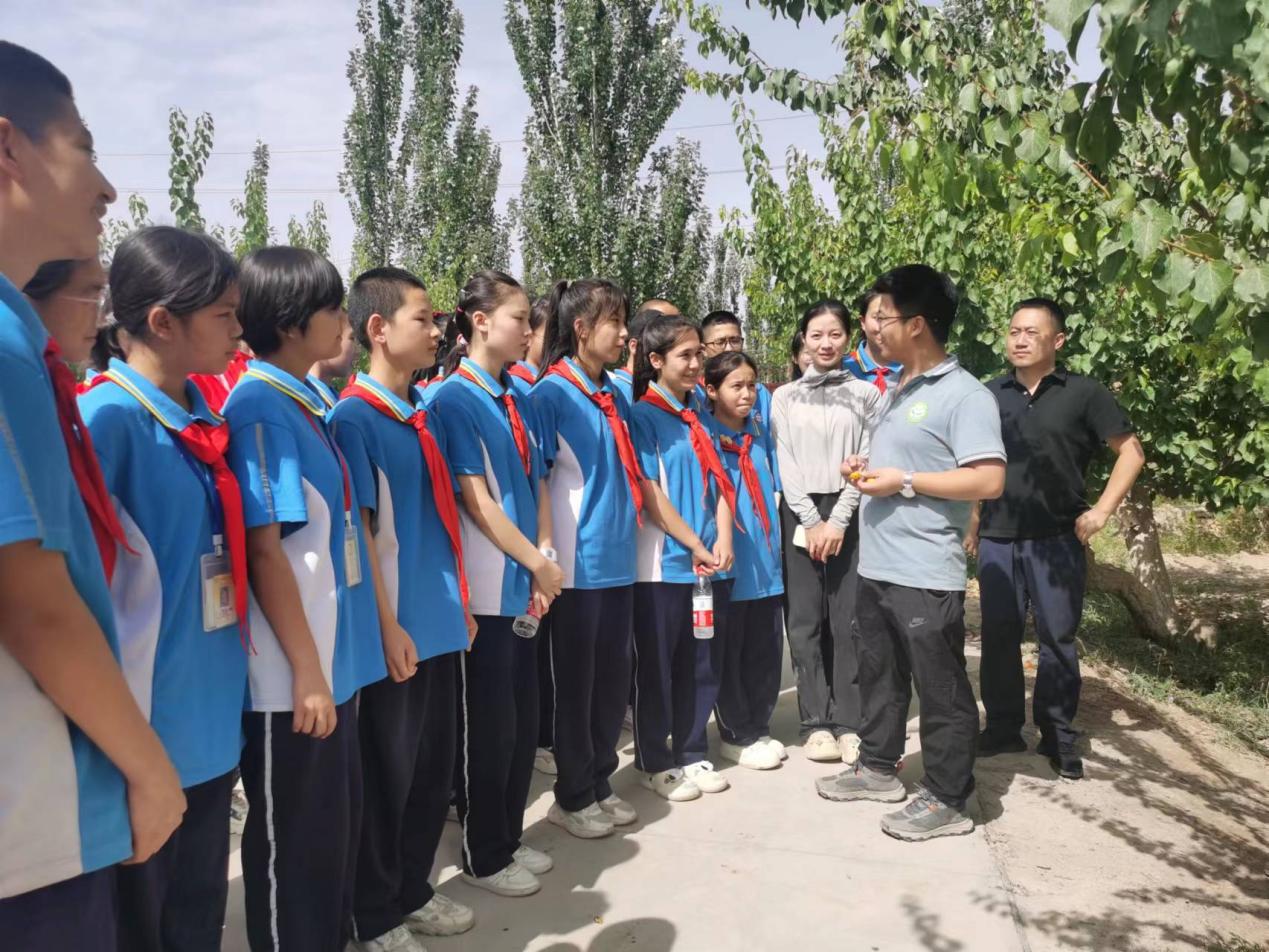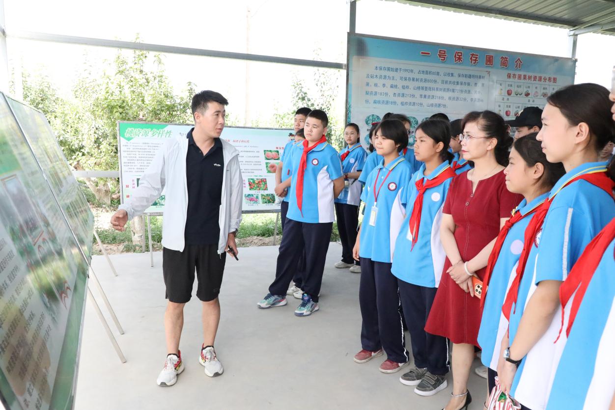 活动中,轮台果树资源圃科技人员、新疆园艺学会专家结合展板向同学们简单介绍了果树的分类,详细讲解了果树种质资源的重要性和多样性以及在培育果树新品种过程中的艰辛历程,使学生们对果树种质资源的保护和多样性以及从事果树相关研究的工作内容等方面有了初步的了解。随后,讲解人员带领着轮台县第二中学的师生穿行与茂盛果林之中,与果树近距离接触,并结合具体的果实形状、大小、颜色的特点,为同学们上了一堂生动有趣的果林研学课,同学们在听工作人员讲解的同时,采摘品尝绿树浓荫下的果实,在炎炎夏日中感受甜美的味道。