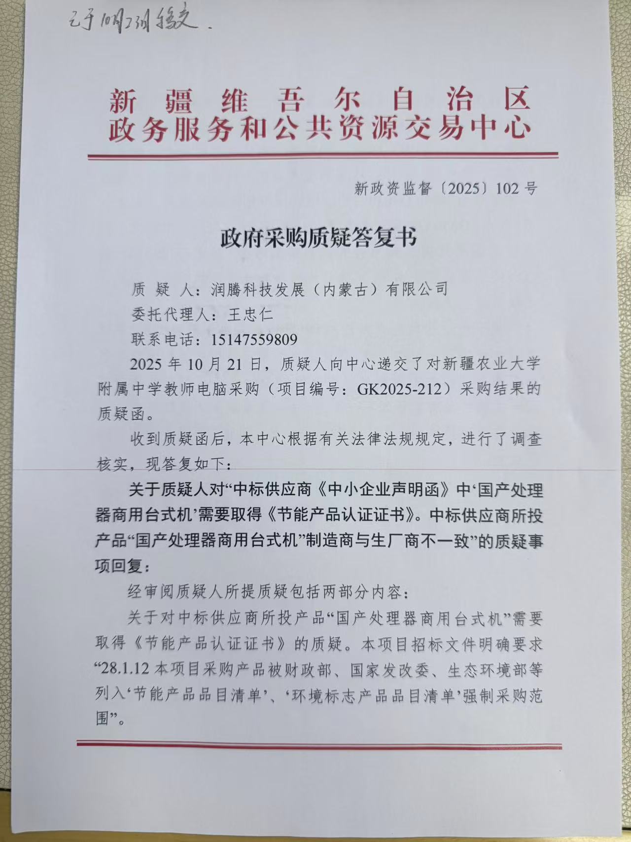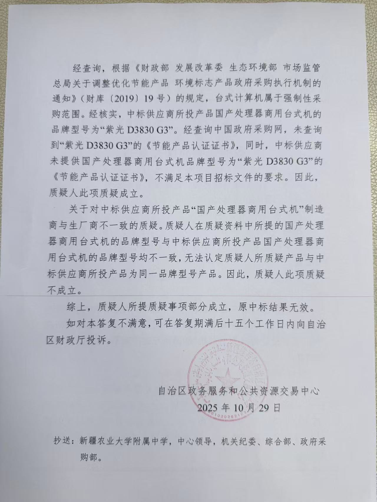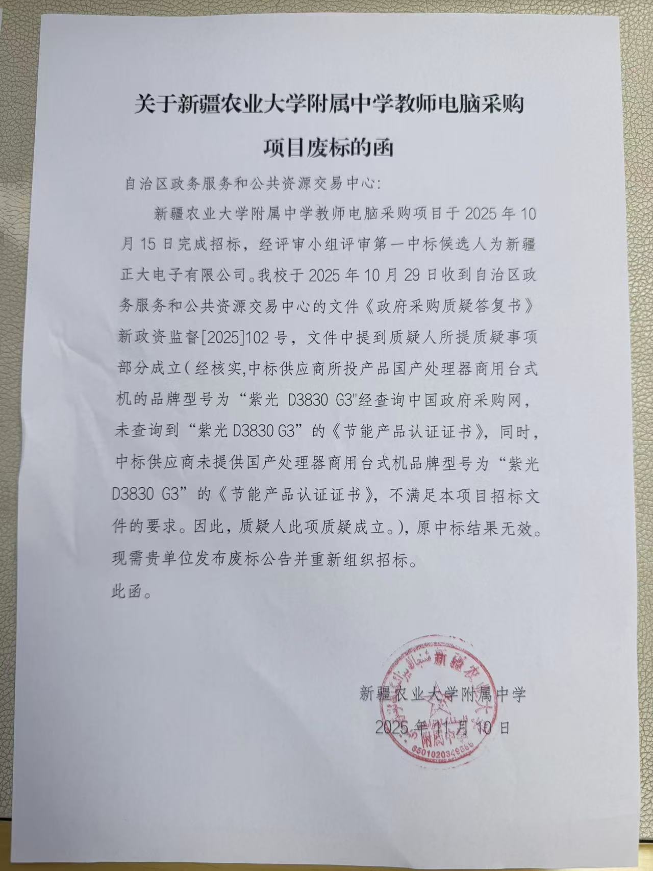 | 1 | 中标结果:中标成交供应商 | 新疆正大电子有限公司 | 因质疑人所提质疑事项部分成立,原中标结果无效。现发布废标公告并重新组织招标。 |