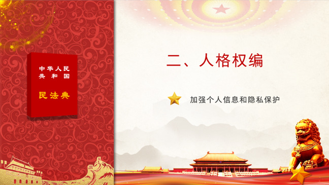 第二部分学习了人格权编:个人信息隐私保护。知道了人格权包括生命权、身体权、健康权、姓名权、名称权、肖像权、名誉权、荣誉权、隐私权等各项权利。
