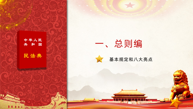 第一部分学习了总则编:基本规定和八大亮点。第一编总则规定民事活动必须遵循的基本原则和一般性规则,统领民法典各分编,我们具体了解了第一条规定《民法典》五个方面的立法目的和其中的八大亮点,且与我们的生活息息相关。