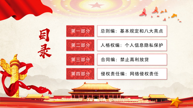 2020年5月28日,十三届全国人大三次会议高票通过《中华人民共和国民法典》,将于2021年1月1日起施行。这是新中国成立以来第一部以“法典”命名的法律,是新时代我国社会主义法治建设的重大成果,是一部固根本、稳预期、利长远的基础性法律。它共分7编1260条,各编依次为总则、物权、合同、人格权、婚姻家庭、继承、侵权责任和附则。本次团课我们重点学习了其中的四个部分。
