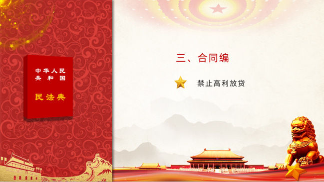 第三部分学习了合同编:禁止高利放贷。近年来,不法分子利用大学生社会认知能力较差,防范心理弱等特点将目标对准高校,肆意赚取学生的钱。作为大学生的我们应该对高利贷行为保持否定的态度,远离高利贷。