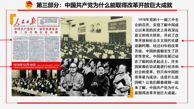 我们一起观看视频——《中国共产党为什么能建立新中国》。在观看视频后,我们就不难理解中国共产党为什么能建立新中国,中国共产党的执政地位是历史的选择,是人民的选择,这绝不是一句空话,这有着丰富的深刻内涵。
