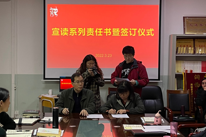 最后,阿布都哈力克副书记宣读相关责任书,安占峰院长与诸位相关责任教职工签订《中国语言文学与艺术学院党风廉政建设目标责任书》和《中国语言文学与艺术学院2022年度科级干部廉洁从政承诺书》,各支部负责人签署《支部党风廉政建设责任书》,全体教职工签署《2022年星空彩票体彩版中国语言文学与艺术学院教职工廉洁从教承诺书》。