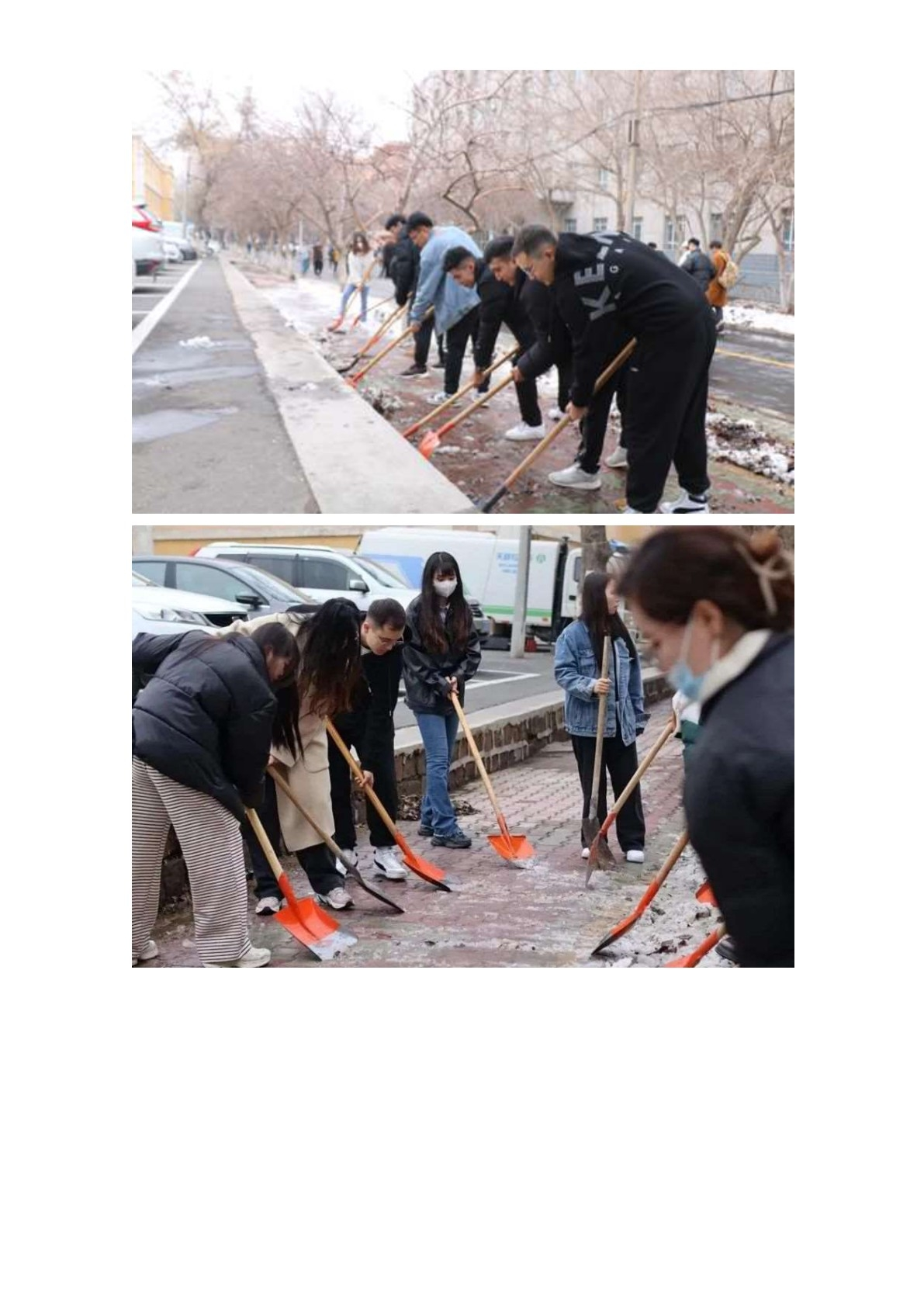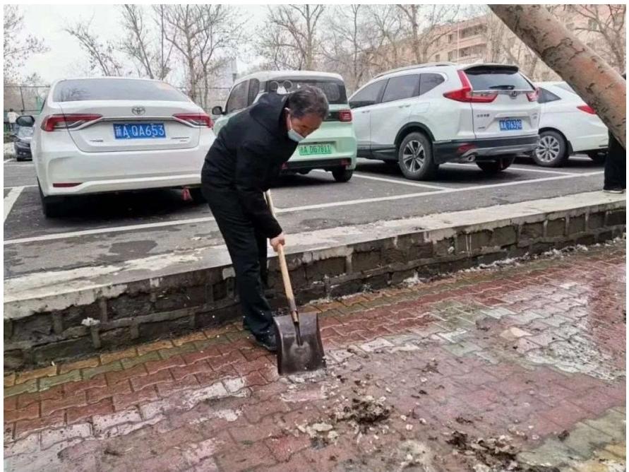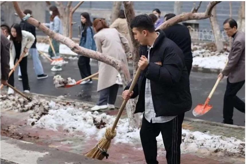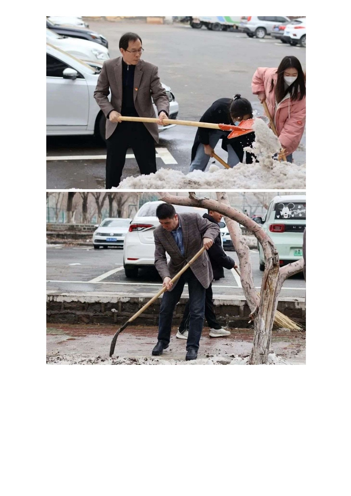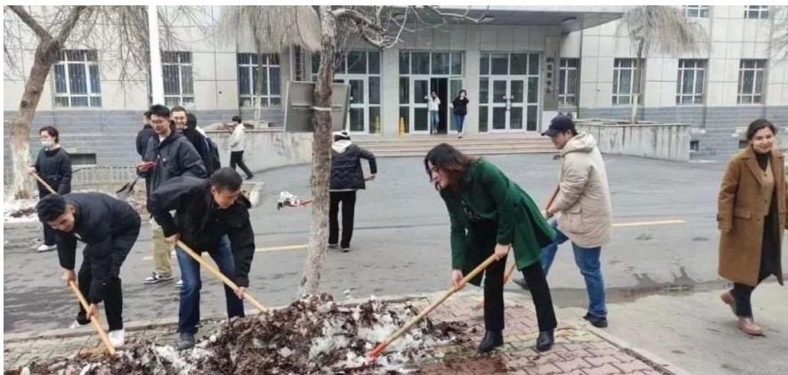 教职工党员和全体学生党员分工合作、互相配合,经过一个小时的劳动,学院楼前人行道和兵乓球台旁的积雪基本被清除干净,环境面貌焕然一新。