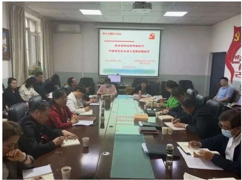 会上首先由中语学院党委书记杨文革同志及教工党支部组织委员卿育红同志介绍了学院主题教育工作进展情况及教工党支部的人员相关情况。