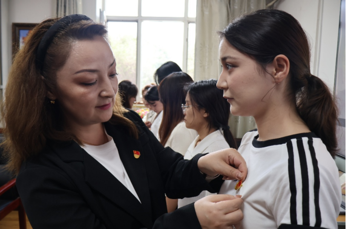 由团委书记阿依努尔·买买提和团委副书记阿依达娜同学,为新团员佩戴团徽。团徽,不仅仅是一枚徽章,更是一份荣誉,一份责任。