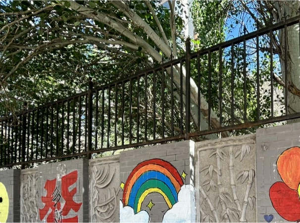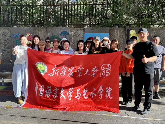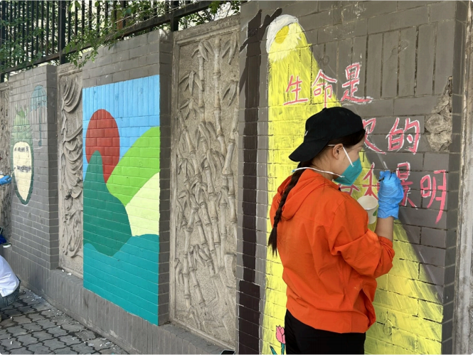 应乌鲁⽊⻬市扬⼦江路宝⼭路东社区邀请,汉语⾔ 2301班的同学们在乌鲁⽊⻬夏末的晴空下,⽤蘸满颜料的画笔正悄然改写城市街角的记忆。将脱落斑驳的墙化作流动的画卷,他们⽤⻘春特有的⾊彩为⽼街区披上霓裳。