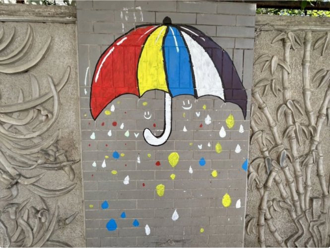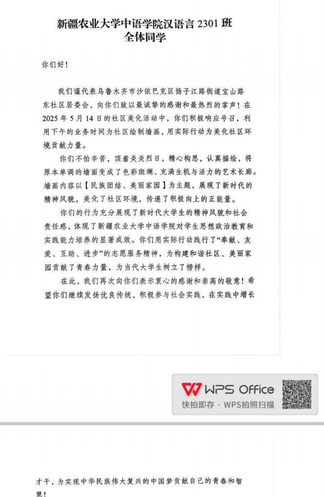 中语er的此次社区改造活动圆满成功,并且深受居⺠的喜爱。当最后⼀笔油彩在⼣阳⾥凝固成永恒,这场⾊彩实验的余韵却在持续发酵Ì乌鲁⽊⻬市融媒体⽤镜头记录下了创作间隙的欢声笑语:⼤学⽣们蹲在墙根讨论配⾊时的热烈神情、那些精美的充满童趣的涂鸦都被收录进社区电视台的采访特辑⾥。⽽宝⼭路东社区活动室内那封盖着红章的表扬信正静静舒展。
