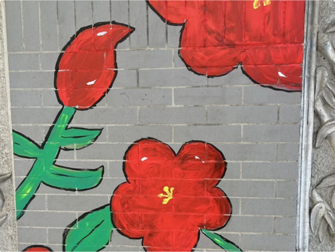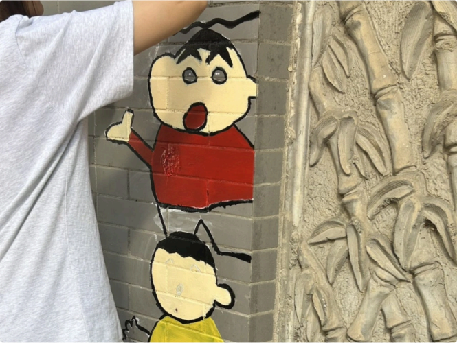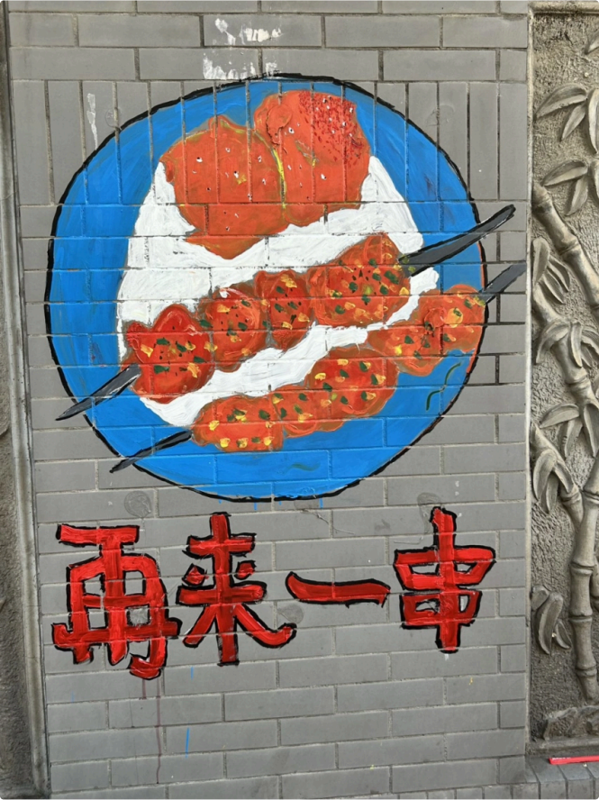 创作时光⾥,墙根下常围满驻⾜的⼈群。原本斑驳的砖墙⽣⻓出《⻓河落⽇》 的彩绘,脱落的砖变成了 “⽣命是只有⼀次的春和景明” ,墙上甚⾄⻓出了⾹⽓四溢的烧烤。