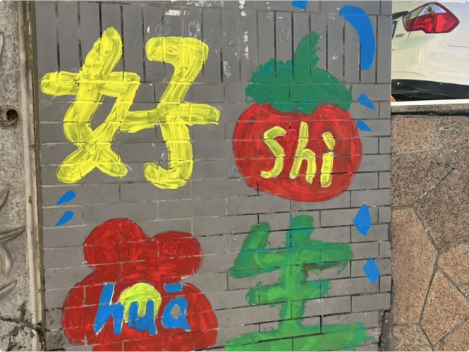 中午时分,⼗⼏位穿围裙的⼤学⽣与拎⽔桶的居⺠已⻬聚墙下。调⾊盘⾥流淌着天⼭雪⽔的蓝、⽕焰⼭的橙。中语学⼦们⼿握画笔,让斑驳脱落的墙体变成了⼀道有⼀道亮丽的风景线。