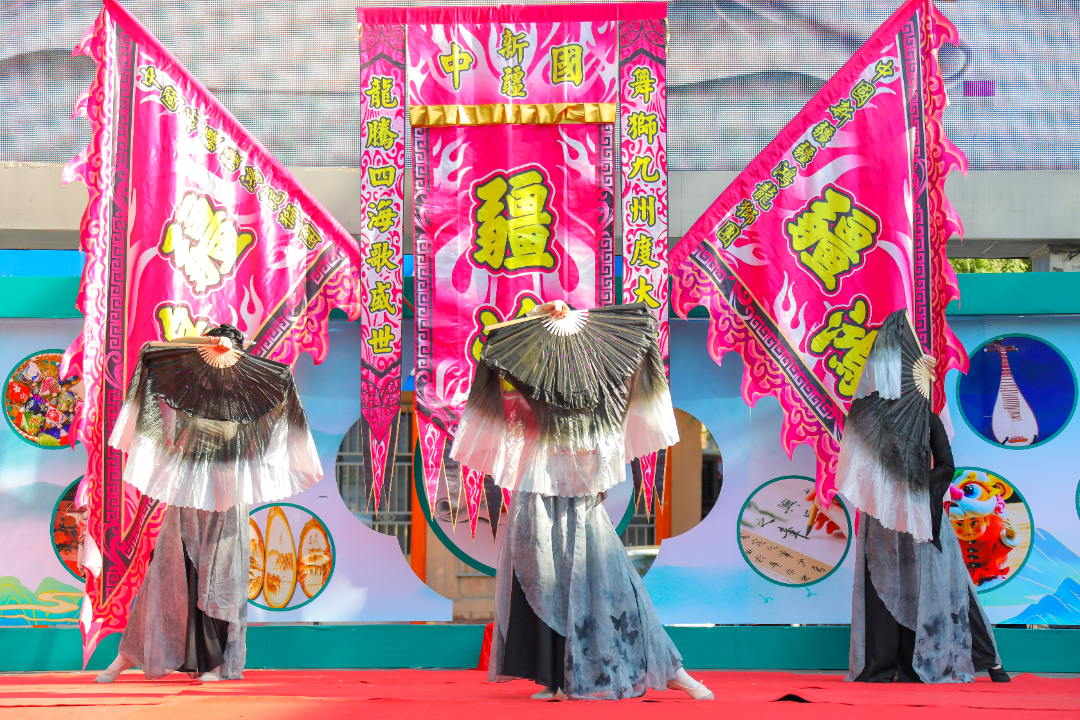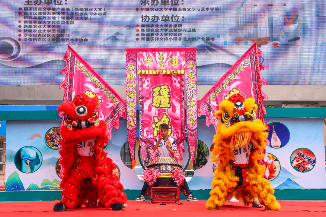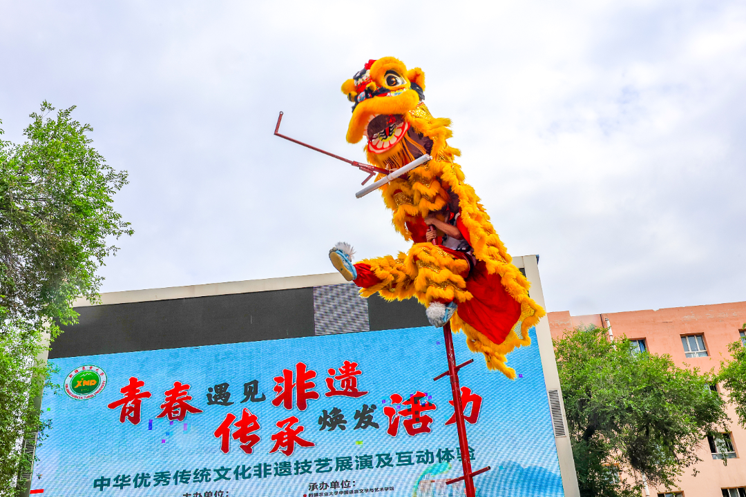 鼓点轰然炸响,疆鸿龙狮团的南狮身姿矫健,一跃而上高杆之巅,瞬间吐出“大展宏图,大吉大利”的醒目竖幅,台下老师与同学们的喝彩声此起彼伏。