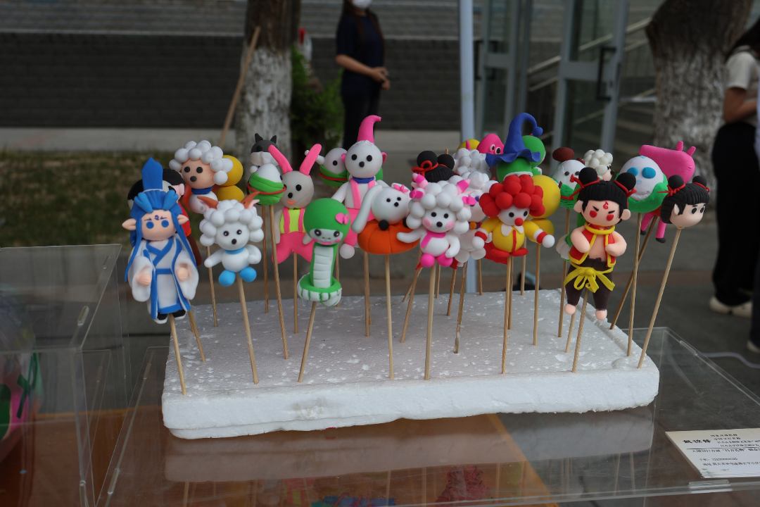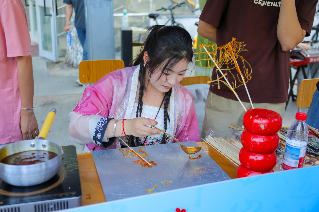 非遗传统技艺体验也热闹非凡,糖画制作区,唐颖绘梦团队的崔煜奇忙碌地为同学们绘制糖人,中国语言文学与艺术学院王玉琦拿着刚制作的第二课堂成绩单管理服务中心的卡通形象人物“小艺”糖人,笑容灿烂,对着镜头俏皮比耶,定格下这甜蜜一刻,糖人栩栩如生,香甜四溢。