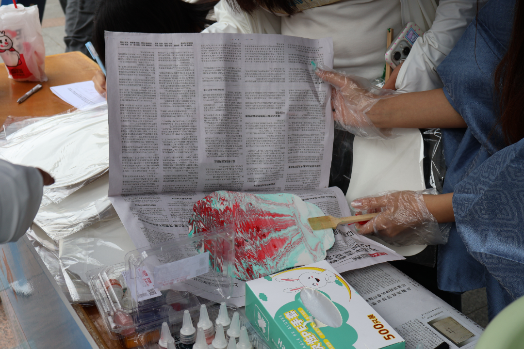漆扇制作区尤其热闹,同学们排起长长大队,精心挑选颜料,制作精美扇子。教师代表程冬洁老师手持一柄刚完成的“如愿”祝福扇,笑容满面。